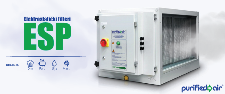 » ESP elektrostatički filter je uređaj za aktivno uklanjanje masnoće i dima iz kuhinjskih para koje potiču iz svih tipova kuhinja. Uređaj se ugrađuje na kanal, i kroz njega protiču kuhinjske pare. Glavna komponenta u uređaju pomoću koje se vrši uklanjanje masnoće predstavlja kolektor sa jonizatorom kroz koji prolazi negativni napon jonizacije.